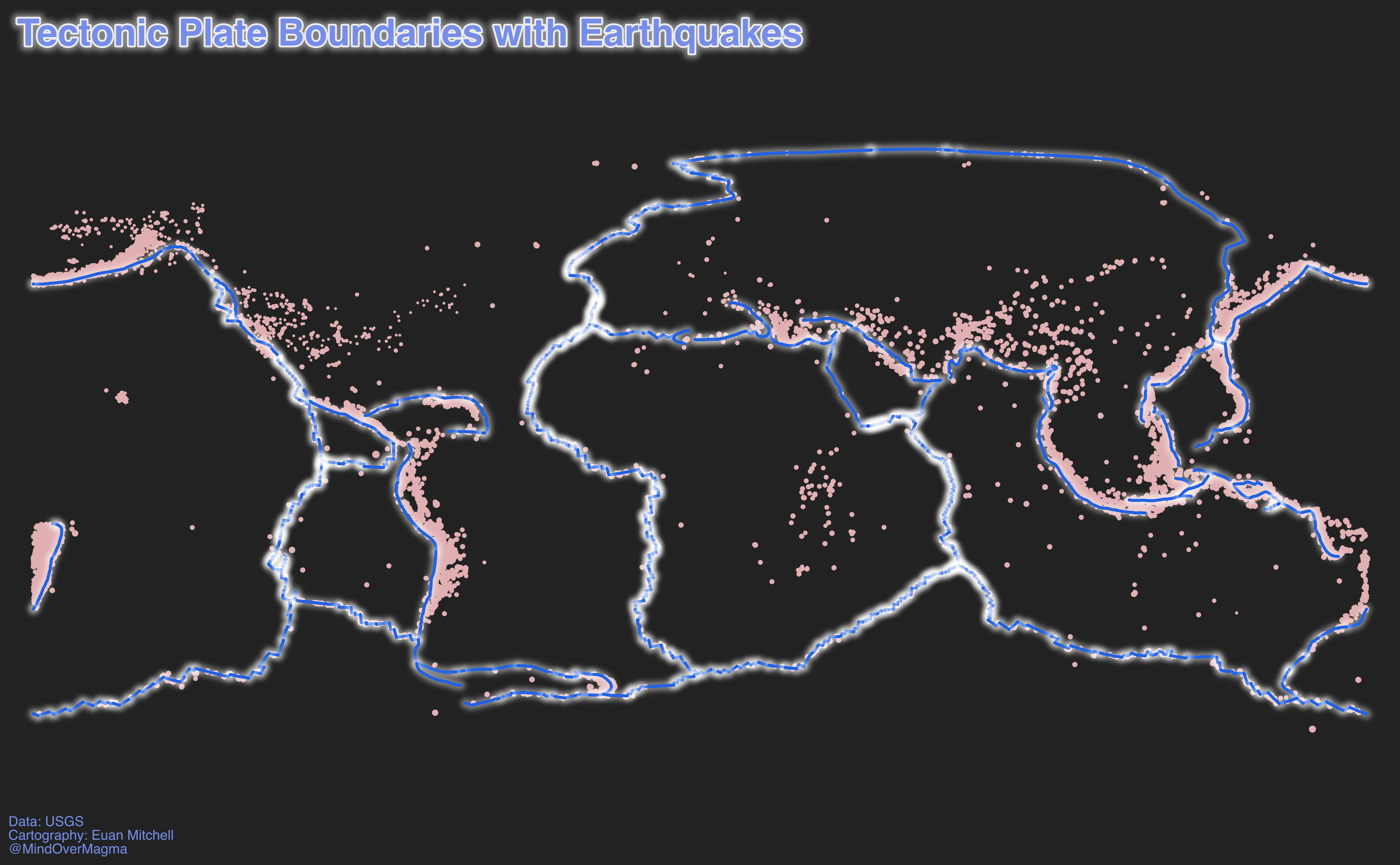 Building on the day 1 theme, I took another USGS dataset and mapped the locations of tectonic plate boundaries, with yesterday’s earthquake data in the background. Should have dissolved the lines first!